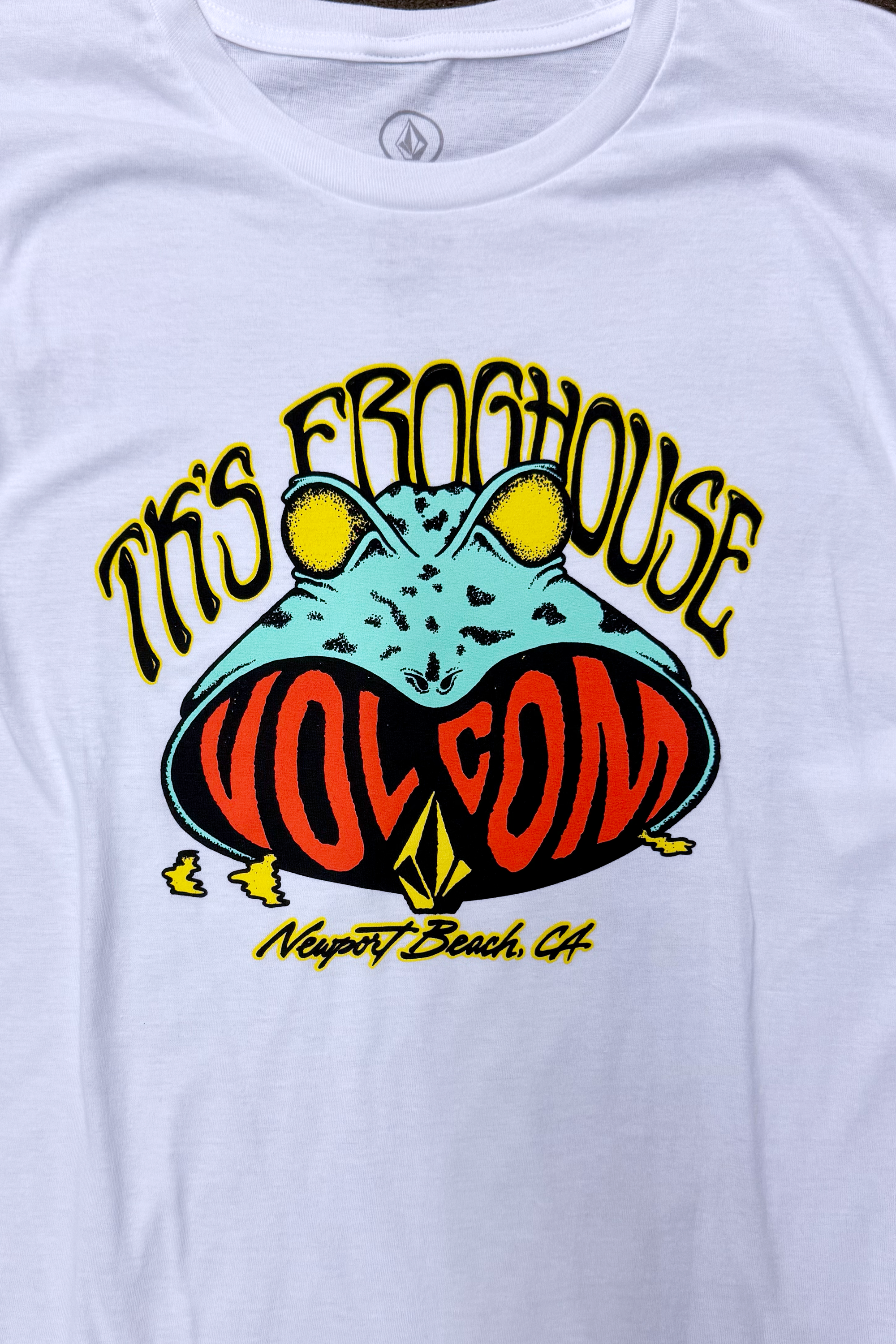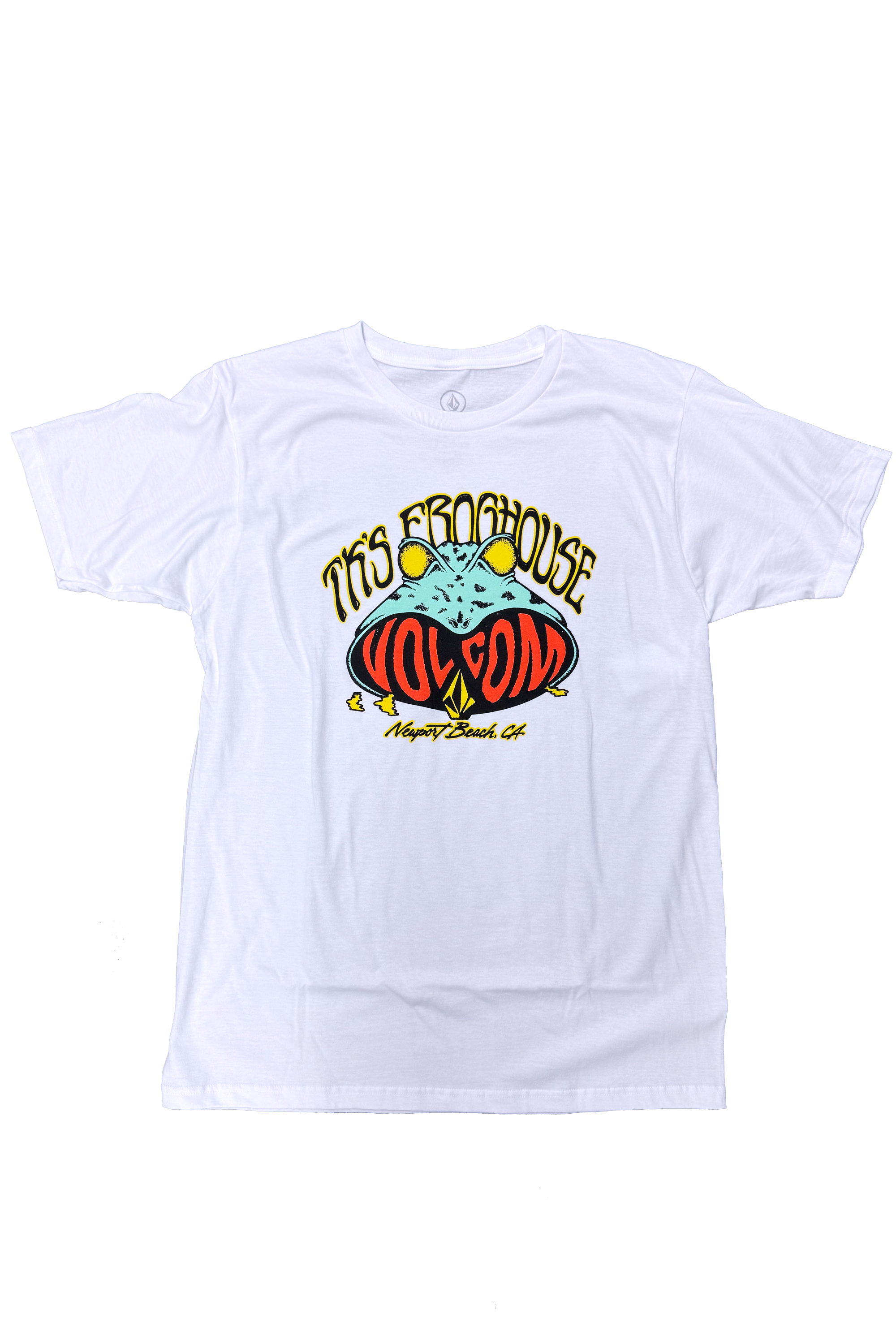 The Volcom X Frog House limited edition tee is crafted from a soft, ring-spun cotton blend featuring the classic Frog House logo with the Volcom stone.