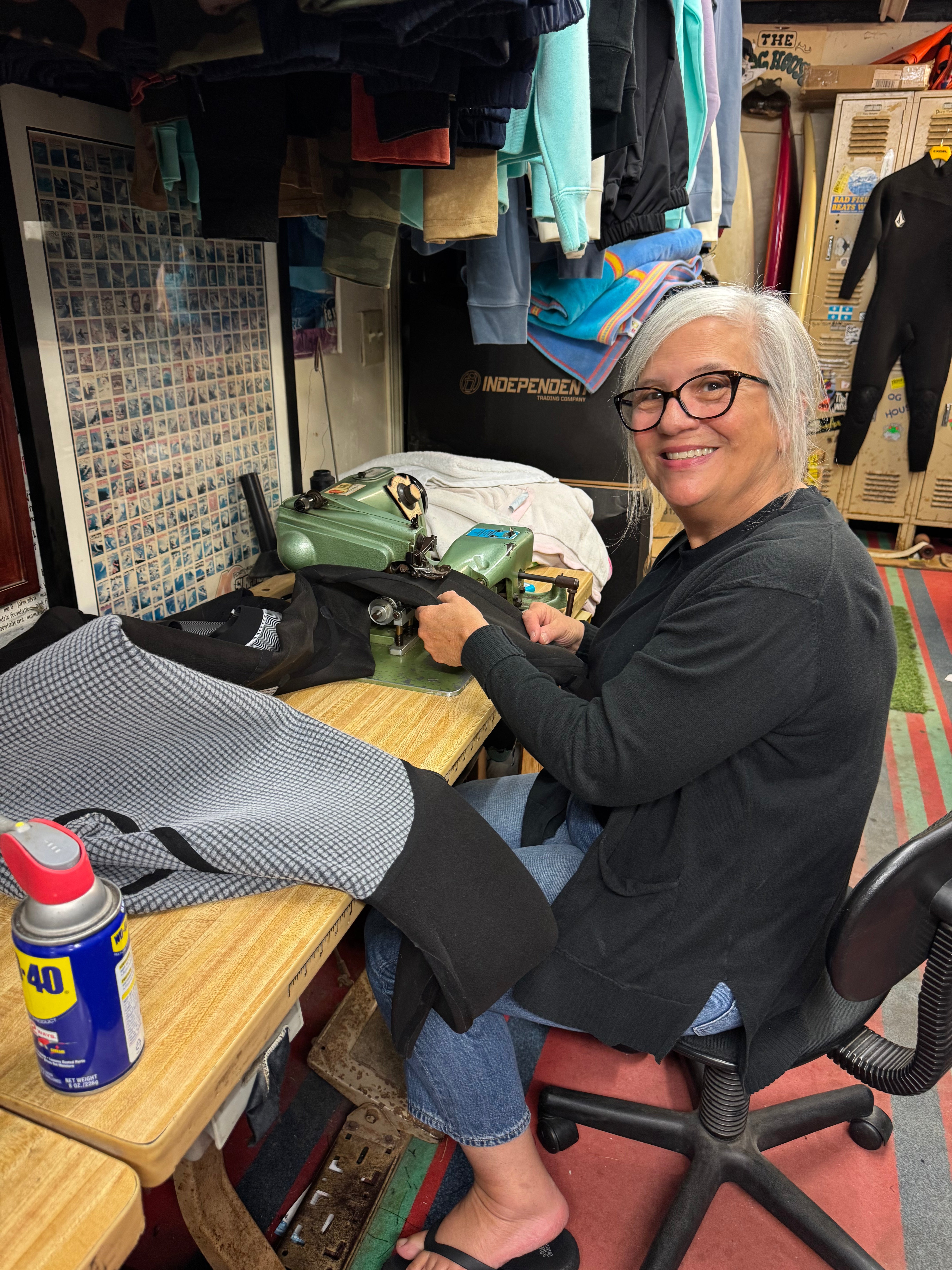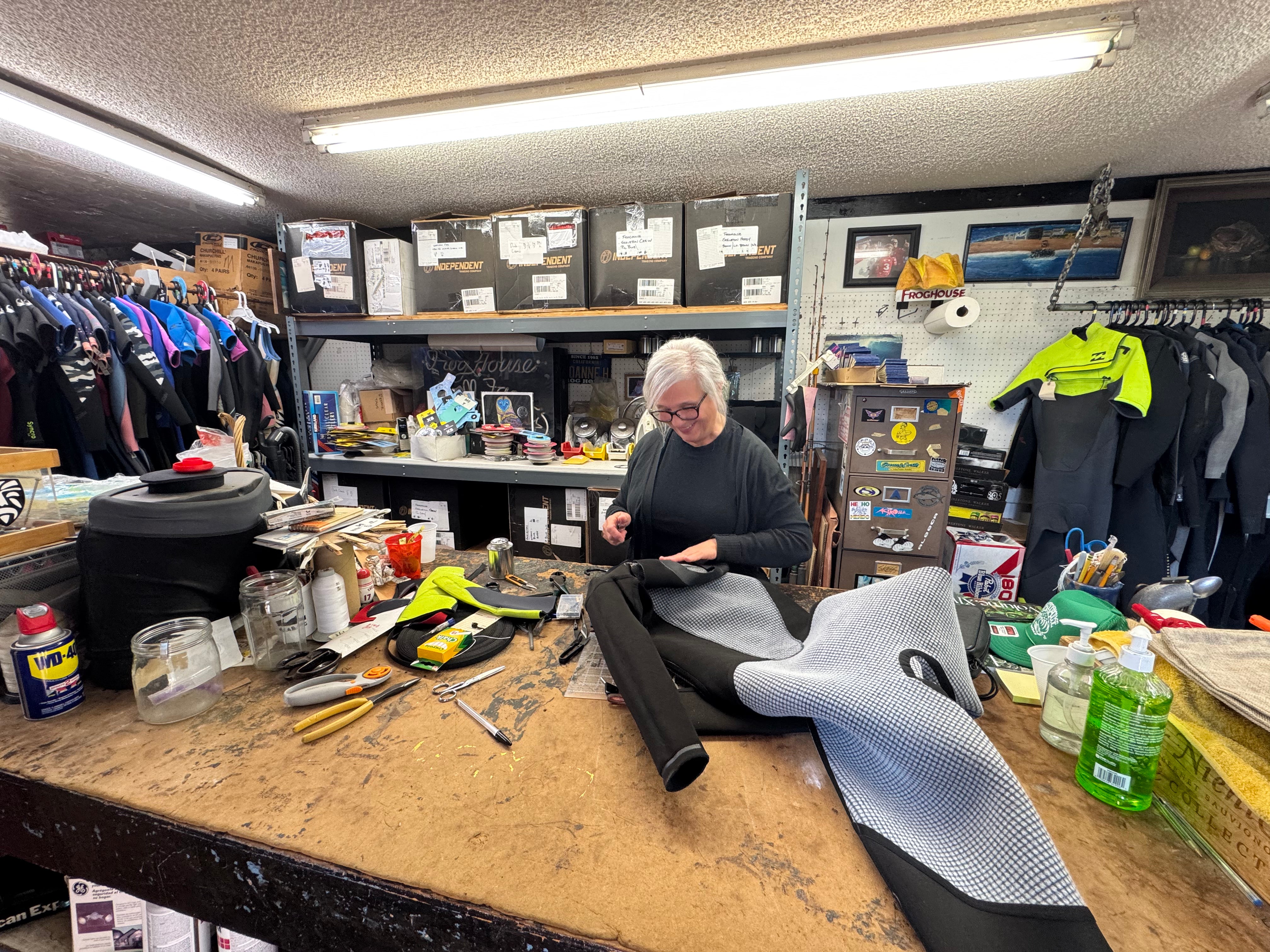 I've had a lot of dog bites. The owner's dog has gotten mad because they didn't take it to the beach, so when they came home the pooch decided to put big holes in it. I've had rat bites if it's been in the garage. Somebody just brought in fishing waders and asked me to add beer coolies on somehow. I've dealt with a lot of injured people who've asked me to put extra neoprene into their suit so that when they lay down it doesn't hurt them. Aside from repairs, I do customizing with knee braces and booties. I've had more than a couple people bring in their suits with fresh blood on them. There are a lot of crazy things that go on. i've also had a number of men come in here who need the crotch of their suit let out a little bit because let's just say it was a little too tight for them
